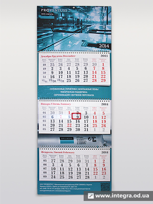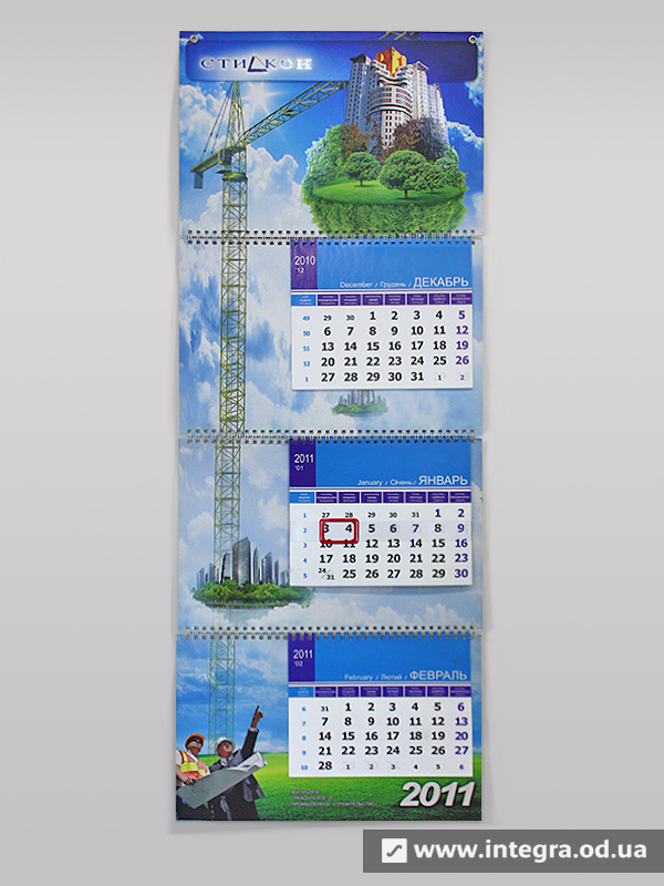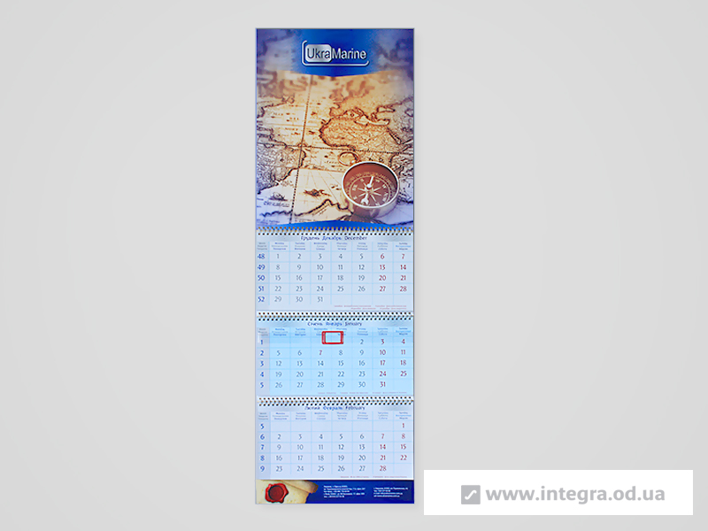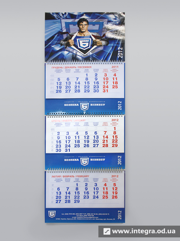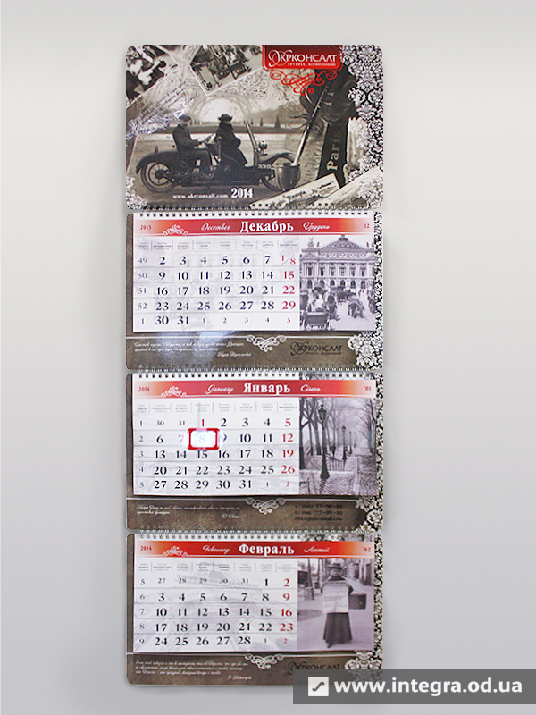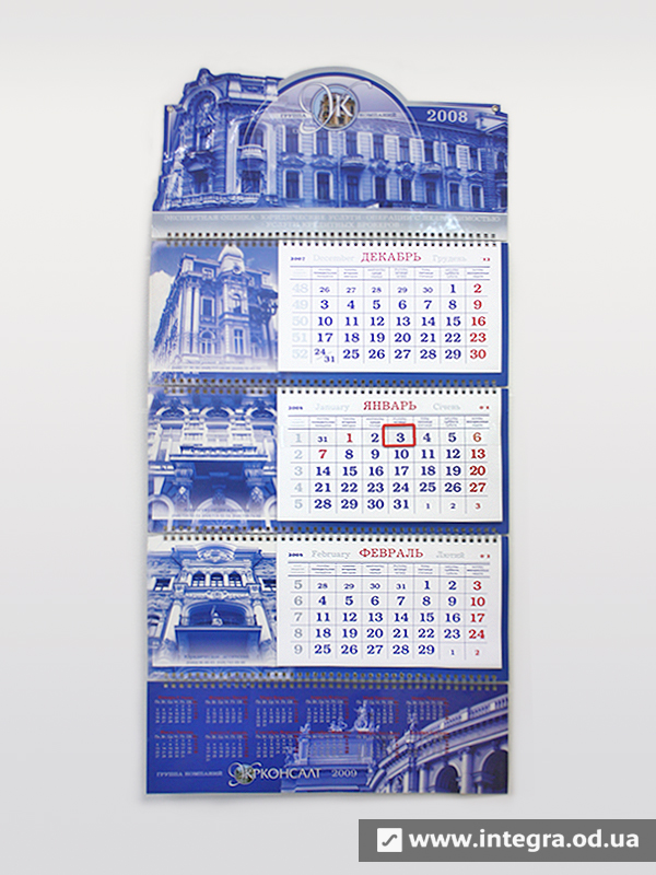 Як правило, квартальний календар складається з рекламних блоків та календарної сітки, а також стрічки із прозорого пластику з віконцем для виставлення дати. Свою назву він носить від того, що календарна сітка складається з трьох блоків по 12 місяців кожен, таким чином Ви бачите на календарі відразу цілий квартал з поточного місяця, минулого і наступного. Друк квартальних календарів, як і решти, залежить кількості і розміру рекламних блоків, тиражу, постдрукарської обробки. Можливо виготовити і квартальний календар із годинником, все залежить від Ваших побажань та вимог. Дізнатись вартість та терміни виробництва квартальних календарів Ви можете, зв'язавшись з нашими менеджерами.